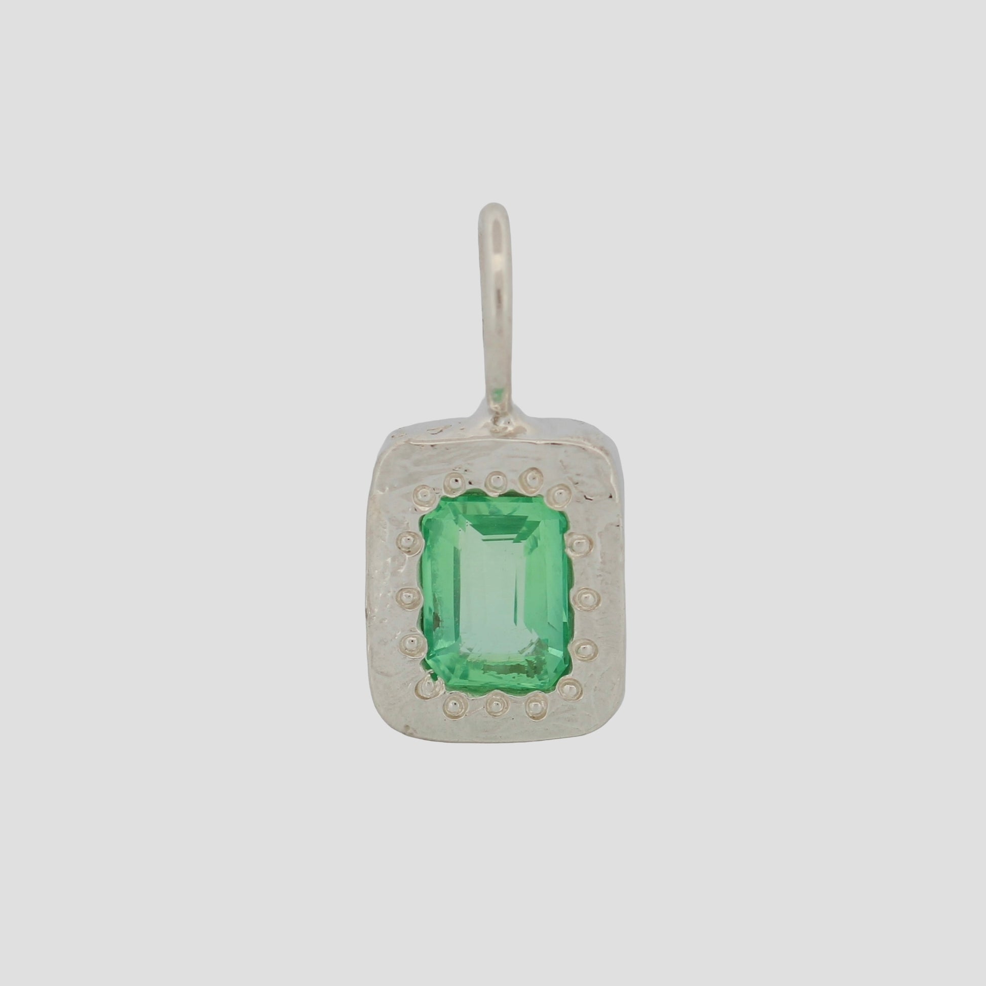 Features a natural lime green sapphire with hand set engravings in textured, solid sterling silver. Pendant bail has been made large enough to fit most standard chains.
